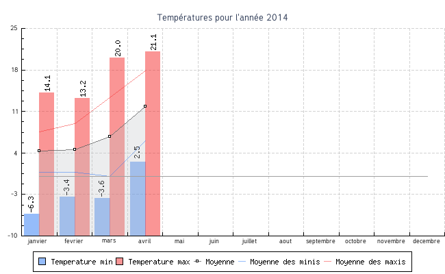 | avril | 2.5 °C | 6.0 °C | 21.1 °C | 17.8 °C | 11.8 °C | 3.4 km/h | 45.1 km/h | S |