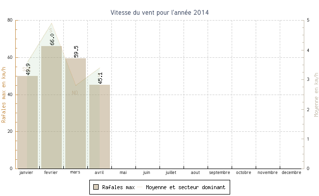 | fevrier | -3.4 °C | 0.8 °C | 13.2 °C | 8.9 °C | 4.6 °C | 4.9 km/h | 66.0 km/h | S |